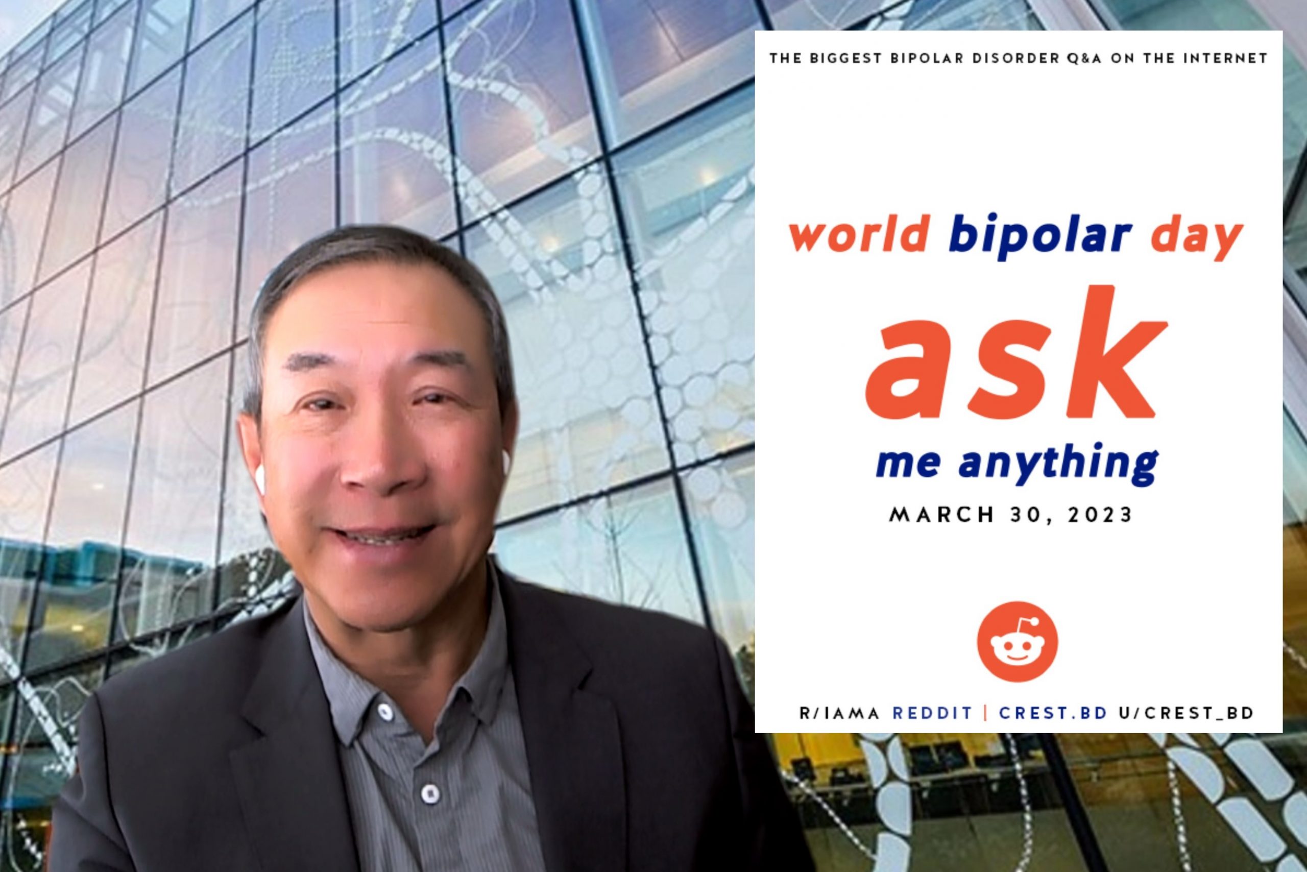 We’ll host the AMA on r/IAmA on Reddit! It’s a platform for question and answer events, where anyone with a Reddit account can ask a question. Our past events have hosted meaningful discussions not only between panelists and individuals living with bipolar disorder but also between people within the bipolar disorder community such as those with lived experience, their family and friends, and healthcare providers. Our diverse team of researchers, clinicians, and individuals who live with bipolar disorder will reply to your questions on all things bipolar disorder from our /u/CREST_BD Reddit account.